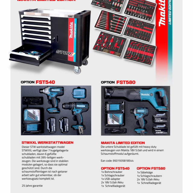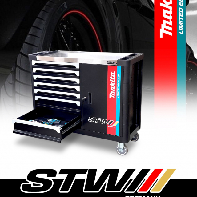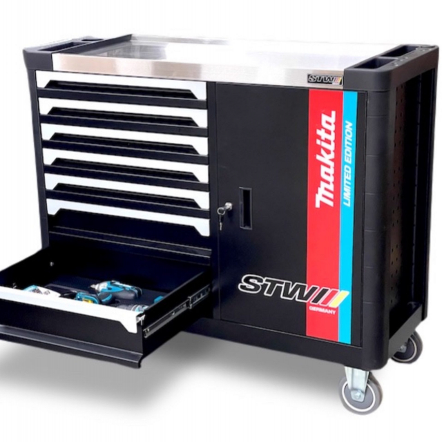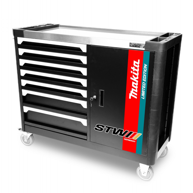 Deze STW XXL gereedschapswagen bij Stahlwerk beschikt over zeven kogelgelagerde laden waarvan 6 gevulde laden met gereedschap. Het gereedschap zit opgeborgen in zes stevige schuimrubberen modules waardoor deze optimaal beschermd zijn. Door middel van de foam inlays kunt u na de werkzaamheden erg simpel zien of de gereedschapsset compleet is. Deze gereedschapswagen is simpel verplaatsbaar door de stevige stuurgreep en de robuuste vier wielen waarvan twee zwenkwielen met rem. Deze gereedschapswagen is geheel afsluitbaar door middel van 2 sleutels passend op het cilinderslot. De wagen beschikt over een extra sterk roestvrijstaal bovenblad.