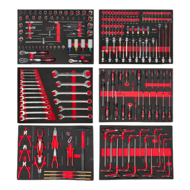 In deze  gereedschapswagen vindt u een uitgebreid 295-delig gereedschapset met onder andere een compleet doppenset met ratels in drie verschillende opnames: 1/2″, 1/4″ en 3/8″. De schroevendraaiers in deze gereedschapswagen zijn van professionele kwaliteit en op de kop voorzien van een zeskant voor extra kracht te zetten met een sleutel of hamer.
