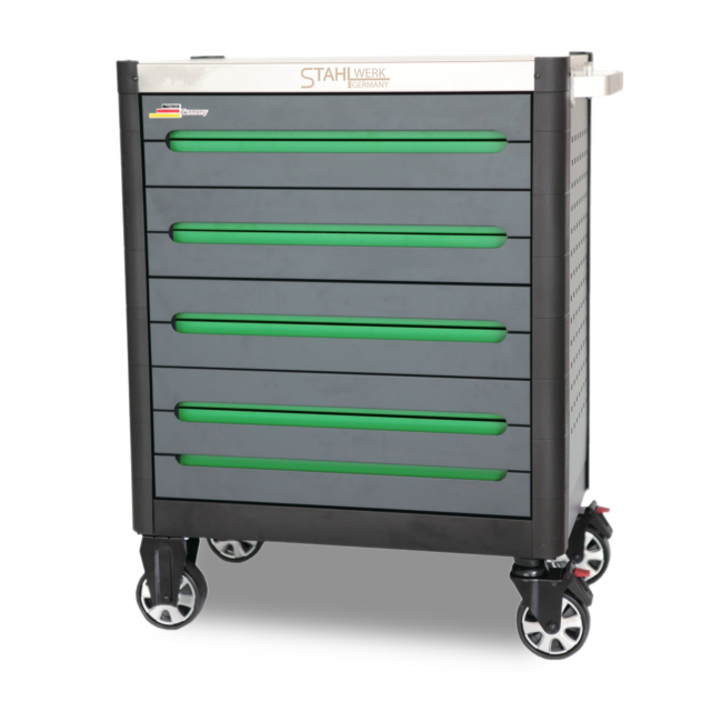 Deze Stahlwerk SW7 model 2023 gereedschapswagen beschikt over 9 kogelgelagerde laden waarvan 7 gevulde laden met gereedschap.
